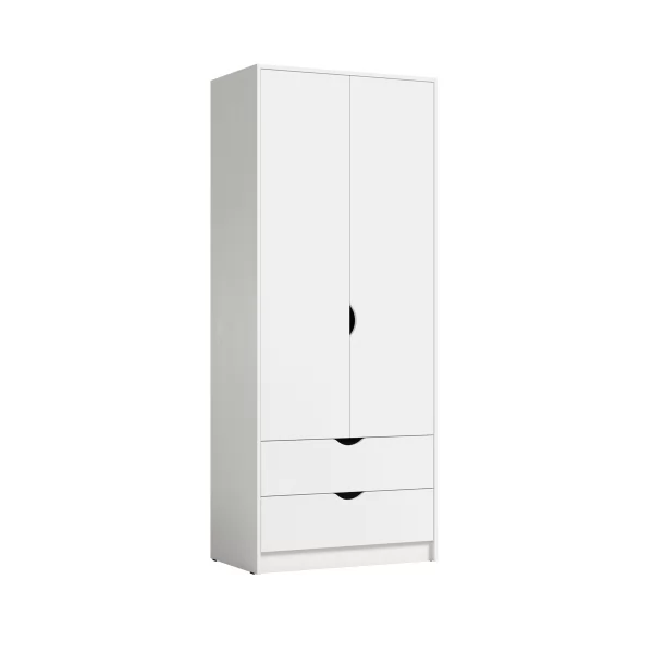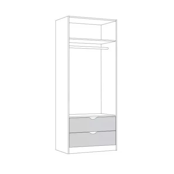 Распашные двери на четырехшарнирных петлях. 2 вместительных выдвижных ящика на шариковых направляющих полного выдвижения. Ручки - вырезы. Поперечная штанга. Корпус: ЛДСП 16 мм. Фасады: ЛДСП 16 мм.