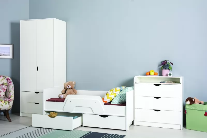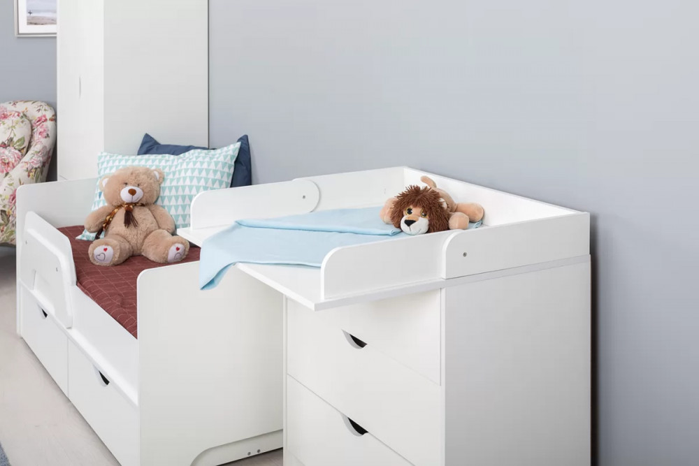 Комод оснащён складным пеленальным столиком и тремя ящиками с шариковыми направляющими полного выдвижения.