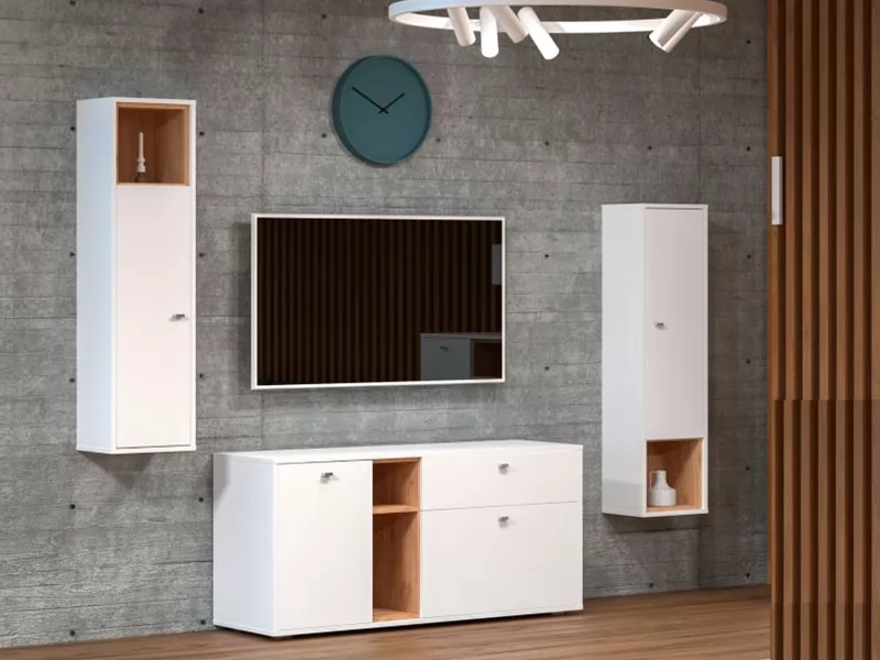 Гостиная модульная система "Бэль" сочетает в себе актуальные цвета и функциональную геометрическую форму с мотивами конструктивизма.
