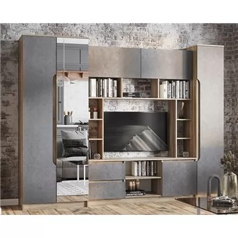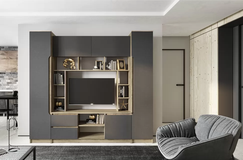 -слегка шероховатая матовая текстура фасадов благородного серого цвета с эффектом декоративной штукатурки в сочетании с -корпусом, выполненном под натуральный дуб подчеркнут ваш безупречный вкус и индивидуальность;
