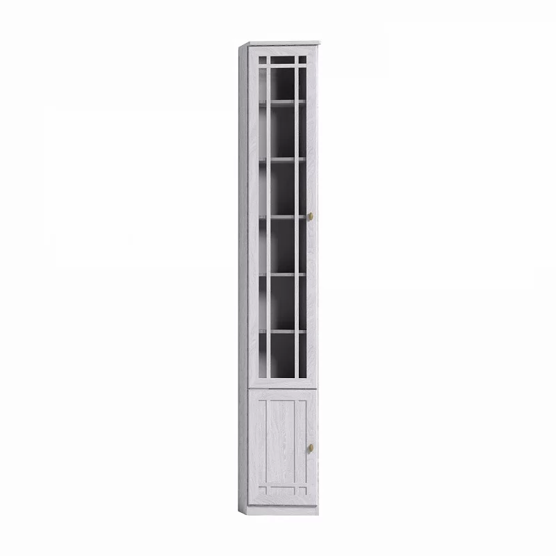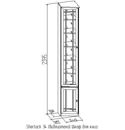 Высокий библиотечный шкаф со скосом влево гармонично завершает компоновку из шкафов библиотеки Sherlock, глубина зауженной части составляет 170 мм. Шкаф со скосом вправо называется Sherlock 35 Шкаф для книг. Библиотечный шкаф можно установить в комнату с высотой потолка не менее 240 см. Высота полок во всех шкафах для книг регулируется, для этого необходимо только установить полкодержатели на нужной высоте в подготовленные отверстия. Это позволит поставить на полки книги и альбомы разного формата. Нагрузка на одну полку не должна превышать 13 кг. Тонированное стекло защищает книги от вредного воздействия солнечных лучей и убережет их от пожелтения. Книжный шкаф обязательно крепится к стене за подвесы и межсекционной стяжкой с другими шкафами в наборе. Библиотека выпускается без выборки под плинтус, чтобы каждый мог прирезать плинтус индивидуально.