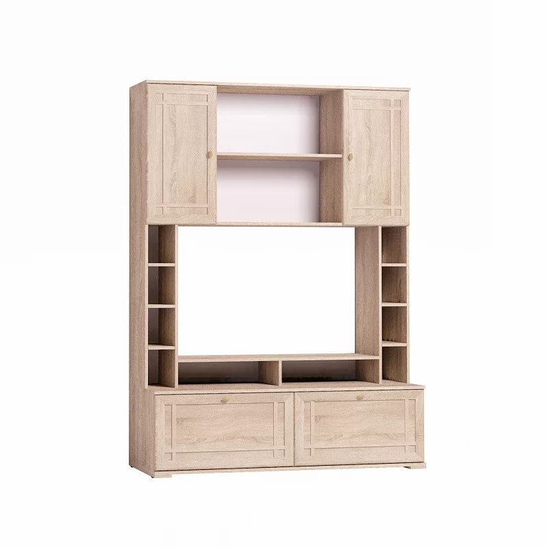 Шкаф МЦН вмещает телевизор диагональю до 44”: высота ниши 725 мм, ширина - 1154 мм. Глубина нижних выдвижных ящиков - 400 мм. Они комплектуются шариковыми направляющими, которые обеспечивают им минимальный люфт и высокую прочность. Один ящик выдерживает нагрузку до 20 кг. Подставку на тумбе под ТВ можно закрепить над нишей, как дополнительные вместительные полки.
