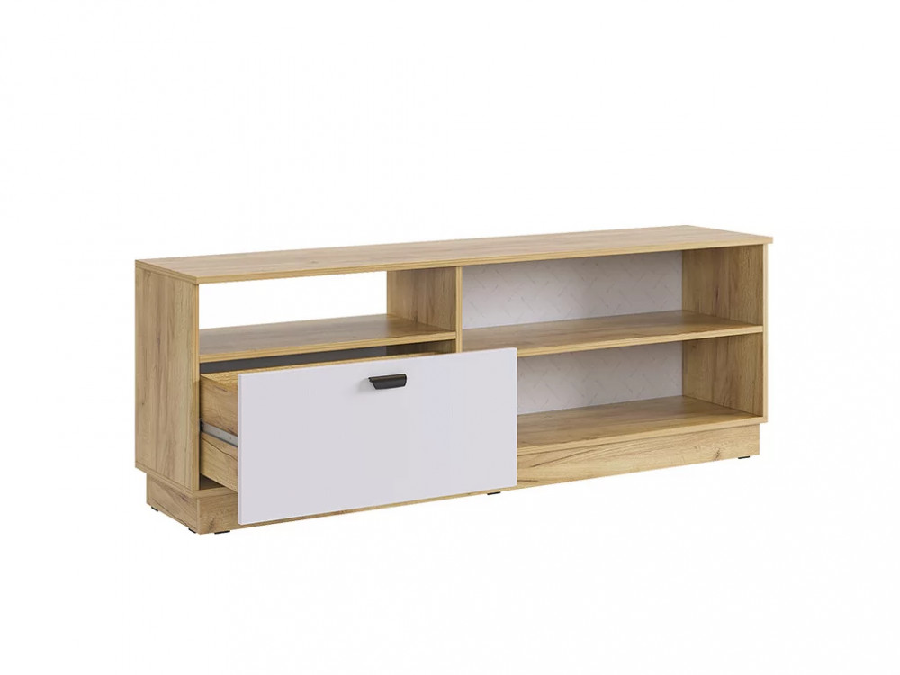 Цвет: дуб крафт золотой/белое дерево Состоит из: тумбы с дверями, выдвижного ящика и открытой секции. Принтерный рисунок на фасаде в виде тонких вертикальных полос- актуальное решение в современном интерьере.