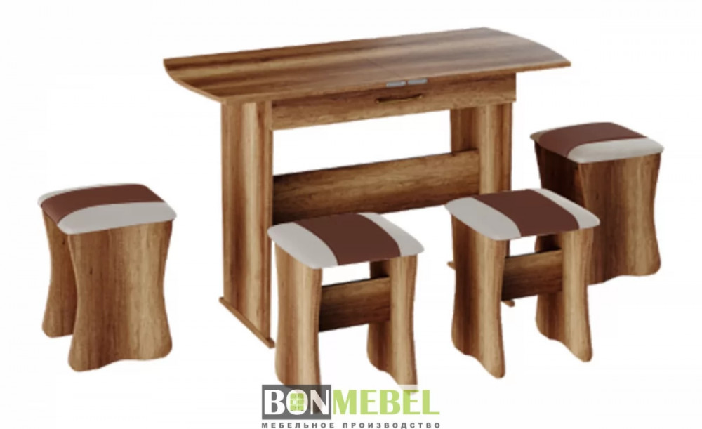 Обеденная группа с табуретами Тип-2 станет практичной и уютной обеденной зоной для вас и ваших гостей. Комплект рассчитан на четыре персоны. Встроенный механизм трансформации позволит увеличить ширину стола почти с 750 мм до 1200 мм. Обивка из экокожи устойчива к различным загрязнениям и не требует обработки специальными средствами. Мягкие сиденья табуретов имеют мягкое и упругое наполнение, что повышает уровень комфортабельности. Различные варианты расцветки помогут подобрать идеальный комплект. Для изготовления изделий используется прочная ЛДСП. Обивка табуретов выполнена из искусственной кожи.
