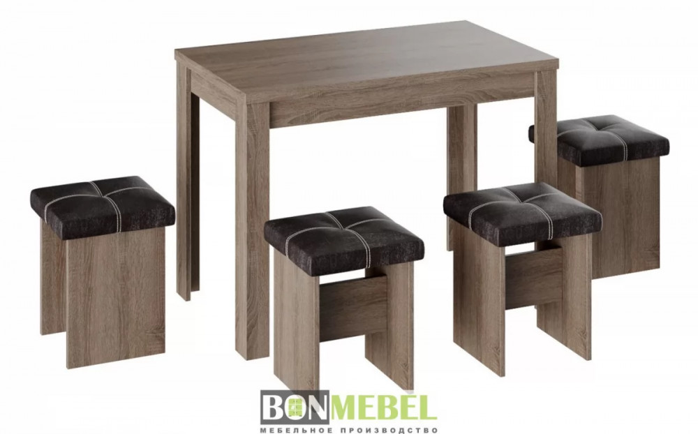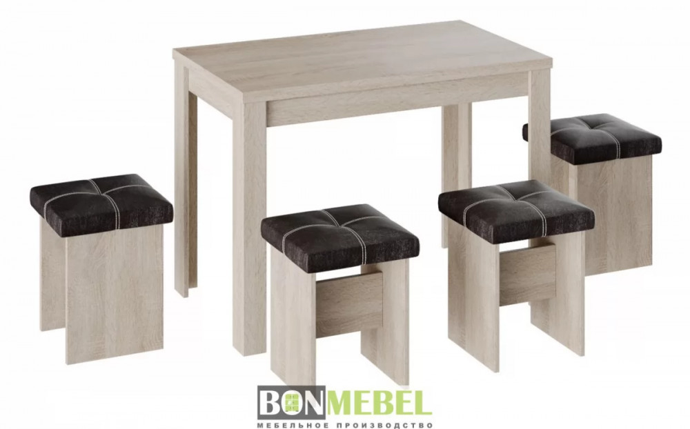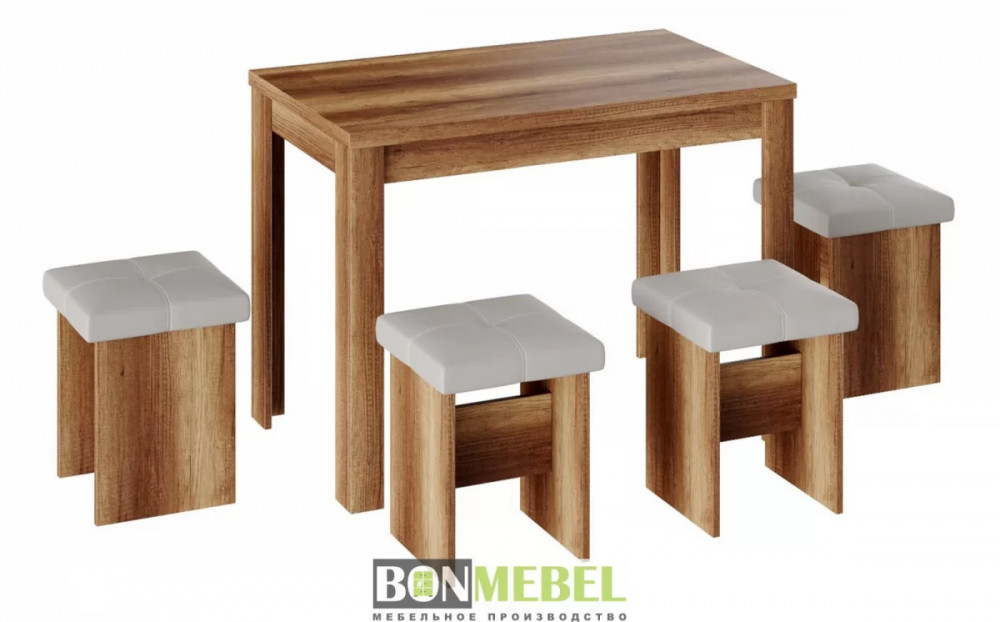 Обеденная группа с табуретами Тип-5 подойдет для оформления малогабаритных кухонь и квартир-студий. Лаконичный дизайн исполнения позволит комплекту сочетаться с любым современным интерьером.к. Обивка из экокожи устойчива к различным загрязнениям и не требует обработки специальными средствами. Мягкие сиденья табуретов имеют мягкое и упругое наполнение, что повышает уровень комфортабельности. Различные варианты расцветки помогут подобрать идеальный комплект. Для изготовления изделий используется прочная ЛДСП. Обивка табуретов выполнена из искусственной кожи.