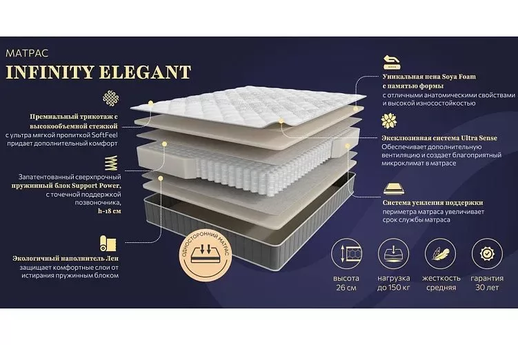 Матрас INFINITY ELEGANT 900*2000мм (Пена/лен, ср.жесткий, h 26см) в Радужном
