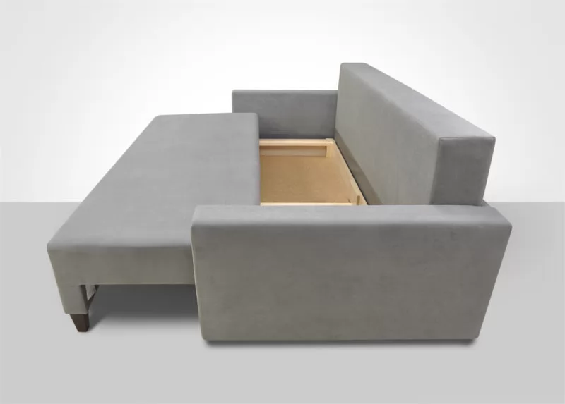 Классический минимализм. Узкий подлокотник, комфортные подушки со съемными чехлами, широкое спальное место.