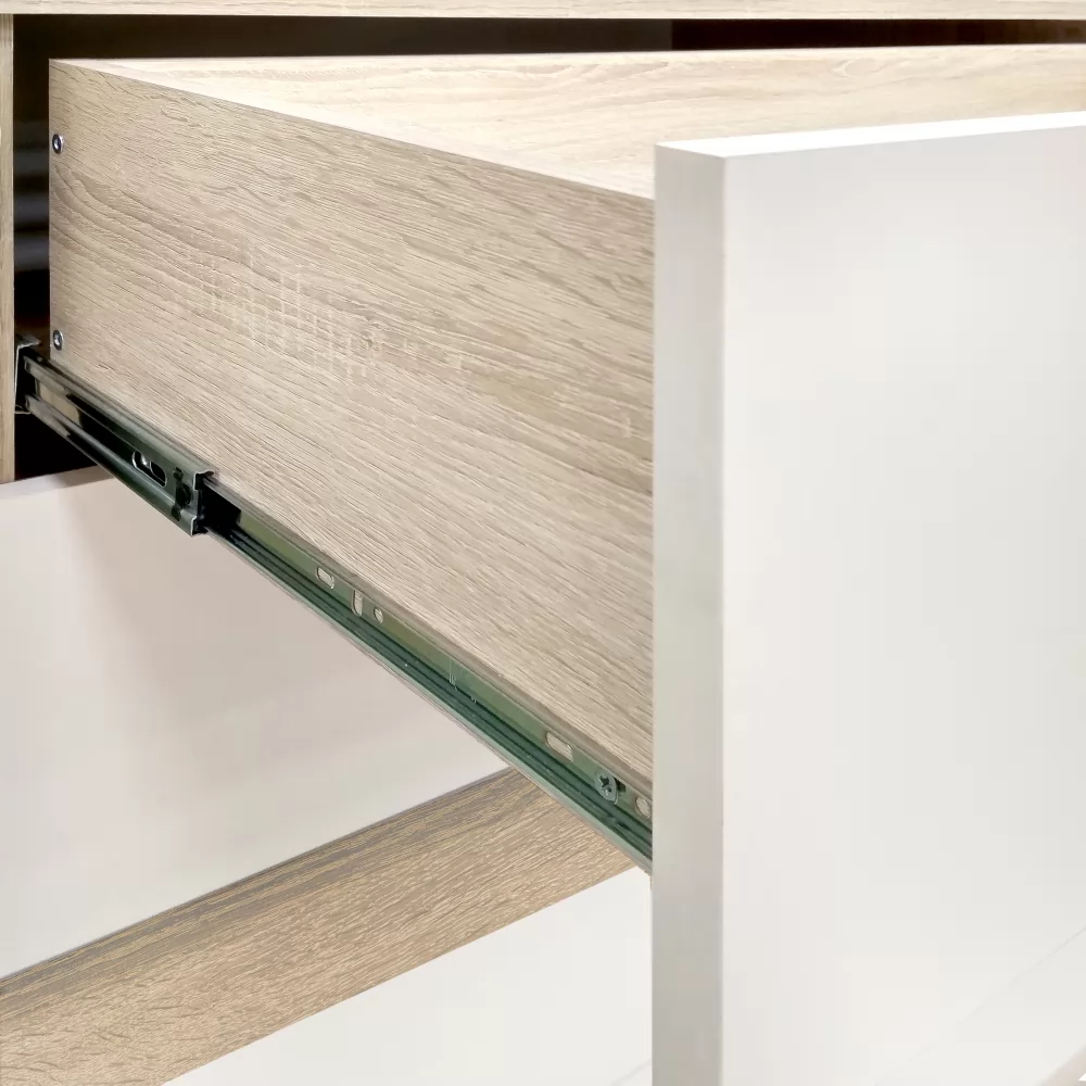 Выкатные ящики на шариковых направляющих полного выдвижения – тихих, надежных и позволяющих увидеть все пространство ящика, закрытые вместительные и открытые декоративные полочки, место для системного блока, рабочая зона – всё практично и удобно.