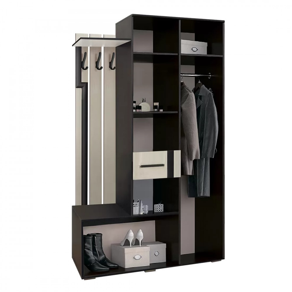 - наполнение модели представляет собой комбинацию открытых и закрытых полок, шкафа с распашными дверцами и отделения для обуви,