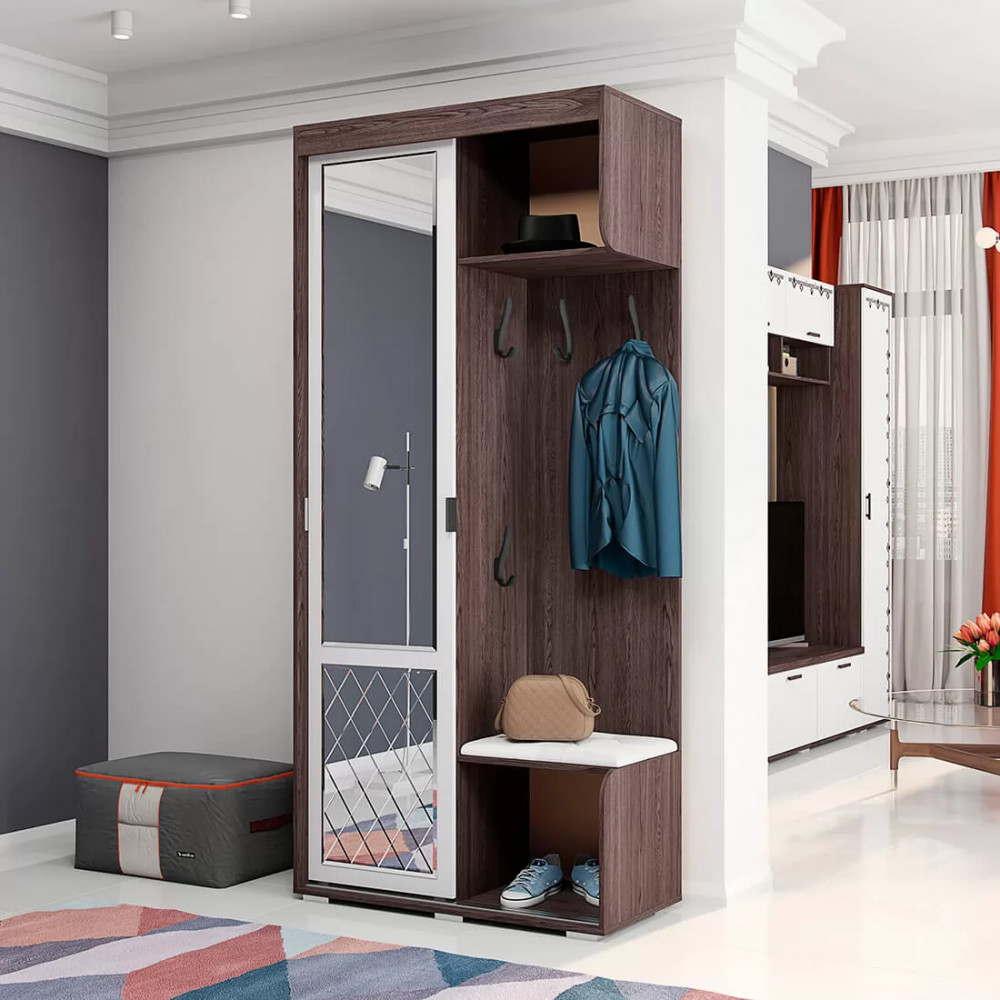- модель очень лаконична и не занимает много пространства, - дверца шкафа, за которой расположились полки и штанга для верхней одежды, оснащена двумя зеркалами, - прихожая имеет открытые крючки, нишу для обуви и небольшой пуф, обтянутый экокожей, - цветовое решение изделия позволит ему стать частью интерьера любого стиля