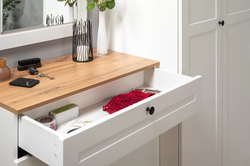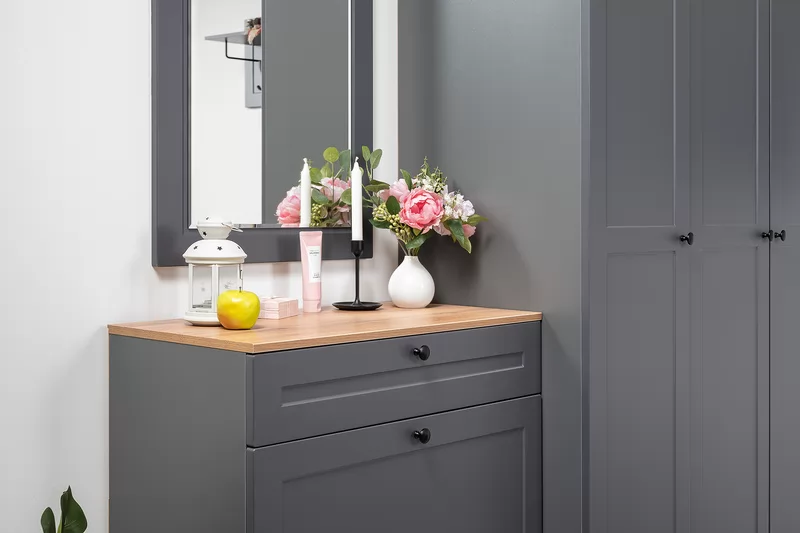 Прихожая доступна в двух цветовых решениях – белый/графит в сочетании с теплым древесным декором.