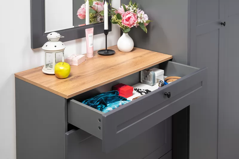 Вместительная шкафная группа позволит оптимально организовать хранение, а продуманные габариты тумбы, комода и зеркала дают возможность собрать различные компоновки.
