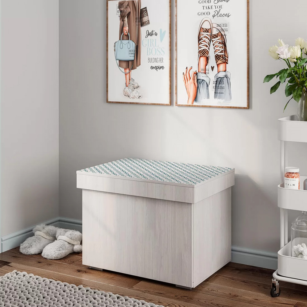 Например, в прихожей она может стать удобной обувницей, а в детской – идеальным местом хранения игрушек. Любая девушка будет рада такой изящной и вместительной «косметичке». Фасад и корпус тумбы выполнены в цвете ясень белый, благодаря чему модель выглядит лёгкой и компактной. Крышка тумбы, на которую фотопечатью нанесён фирменный паттерн, плавно открывается при помощи механизма газлифт. Фасад нижнего выдвижного ящика на шариковых направляющих, полностью закрывает верхнюю полку. Особенностью тумбы являются дополнительные регулируемые полки в верхней и нижней нишах.