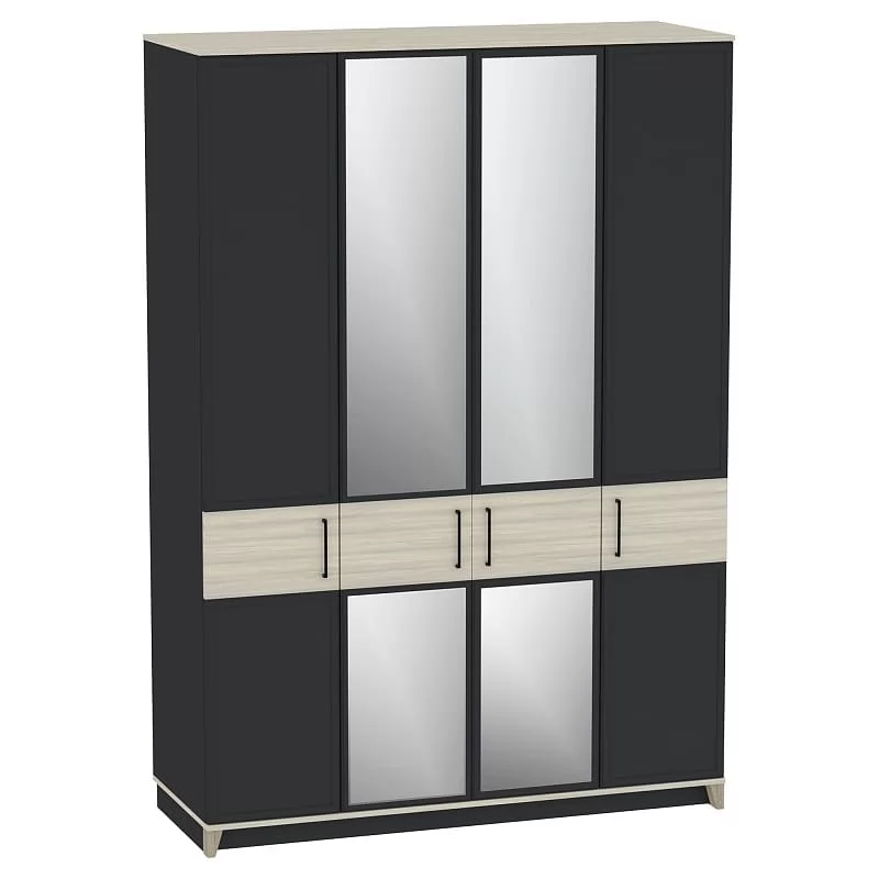 Ширина (мм): 1600 Высота (мм): 2308 Глубина(мм): 600 Материал: ЛДСП,зеркало Цвет: Белый-Блеквуд Сатиновый,Антрацит-Блеквуд Сатиновый Металлические ручки Рамочные фасады из профиля МДФ Стационарная штанга для одежды Полки регулируемые по высоте