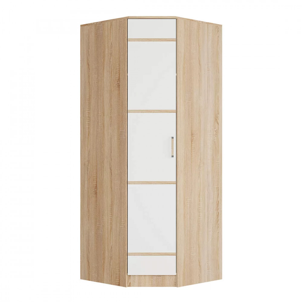 Изделие позволит разместить вам одежду на плечиках в отделении с хромированной штангой, а трикотаж или постельные принадлежности сложить на вместительные полки. Модель изготовлена из ЛДСП в сочетании цветов сонома и белый, будет прекрасно смотреться в интерьере любого стиля.