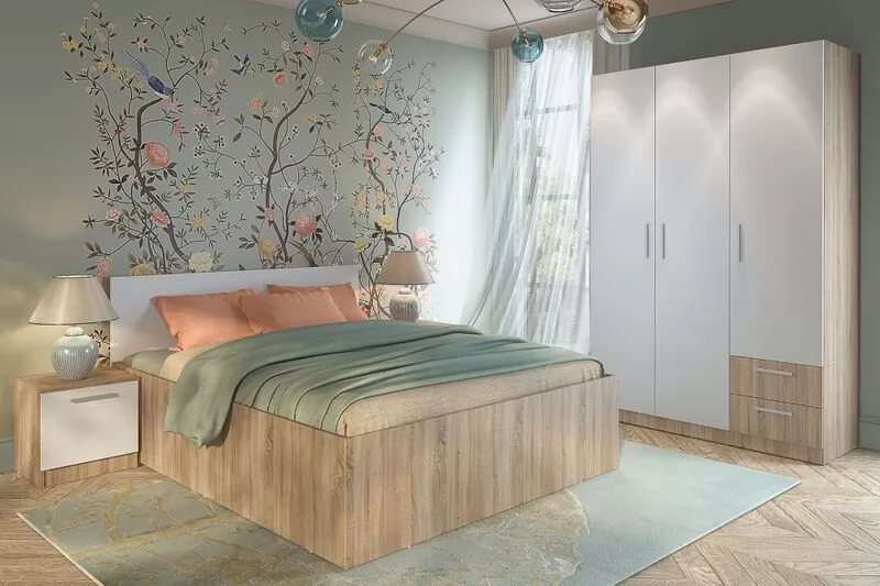 Корпус спальни изготовлен из 16 мм ламинированной древесностружечной плиты цвет –«Белый» и «Дуб Сонома». Торцевые поверхности корпуса закромлены кромками полипропилен. Фасады изготовлены из 16 мм ламинированной древесностружечной плиты цвет – «Белый» и «Дуб Сонома».