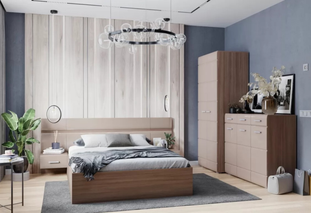 Модули спальни "Вегас" отличаются элегантностью и функциональностью. Стильный спальный гарнитур с мягкими формами и глянцевыми фасадами станет отличным дополнением к вашему интерьеру.    В комплект спальни входит: